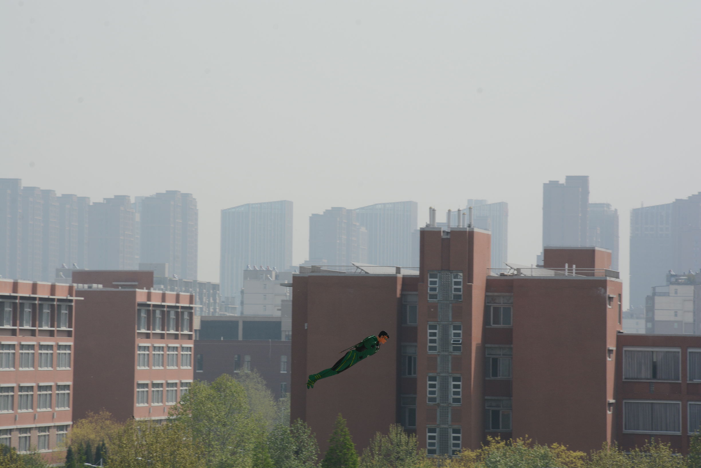 更让人诧异的是,参与表演的十二名跳伞运动员全都是郑州大学体育学院的学生以及校友。有着两千多次跳伞经验的束伊楠,身为首位出场队员从一千二百米高空跳下,以站立姿态精确降落在指定位置,呈现出了世界级的专业水平。