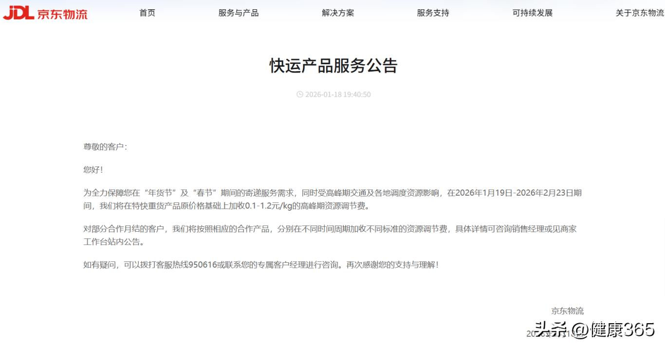 1月23日,顺丰于官方微博再次表明,自2026年春节起,将持续推行“春节不打烊”举措,揽收以及派送工作会正常开展,不过会额外收取一定数额的资源调节费。而在同一天,京东物流告示称,全国核心城市会维持正常配送状态。