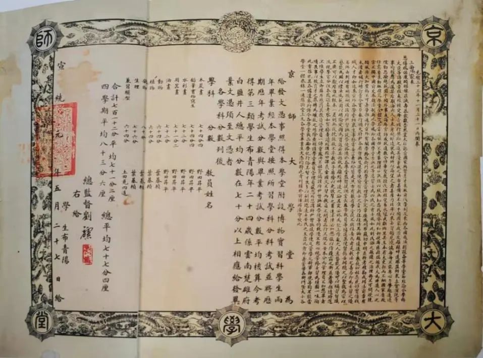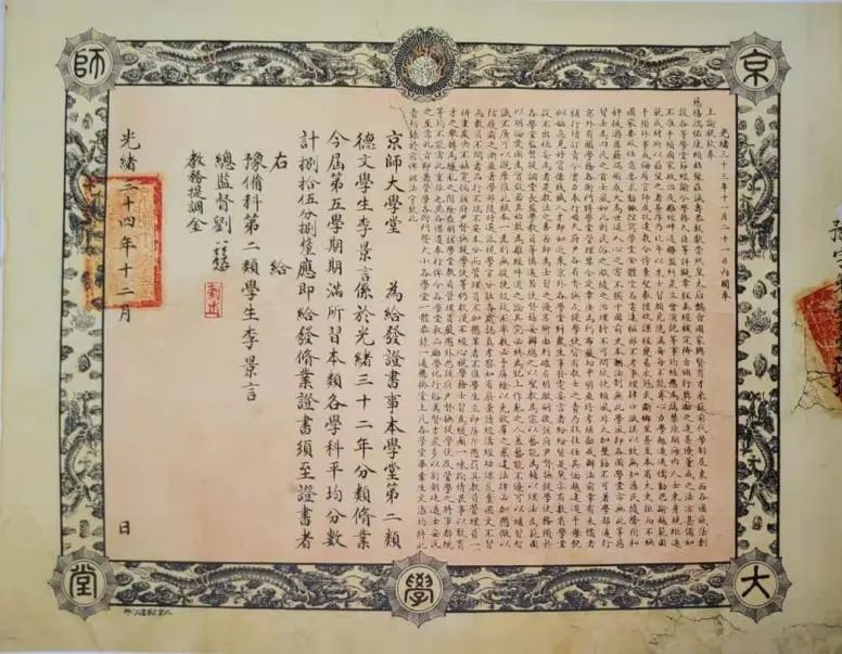 1908年,在京师大学堂修业证书之上,其四周于装饰之处有着威严的龙纹边框,在四角的位置写着“京师大学堂”字样,这般设计极为鲜明地体现出当时高等学堂毕业证书所具备的封建皇权特征,而龙作为皇权的象征,被印刻于学子的学业证明之上。