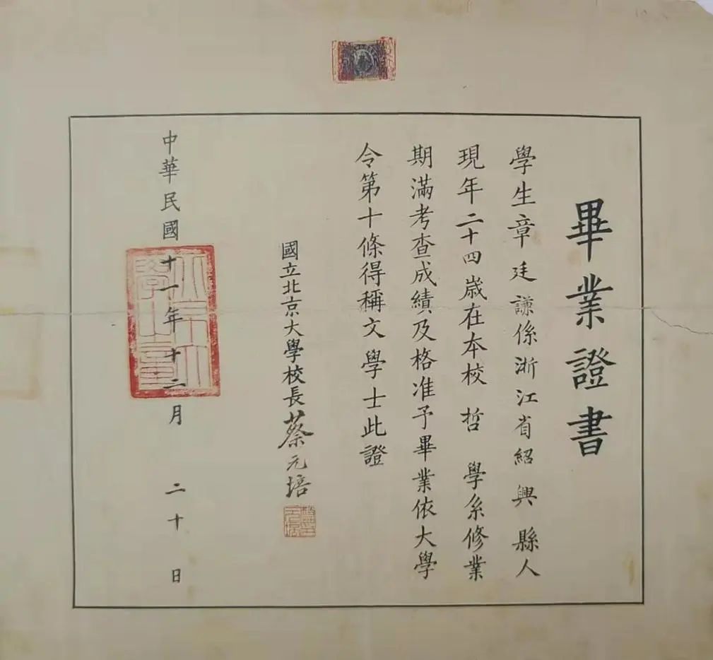 1922年,颁给哲学系毕业生章廷谦的国立北京大学毕业证书,其内容相较于晚清时期,简洁了许多。证书上面,仅有毕业生基本信息、所授学位、校长签名以及印章、颁证日期等核心内容。毕业生的成绩,已与文凭分开,单独进行记录。这种分离,体现了教育管理的专业化趋势。