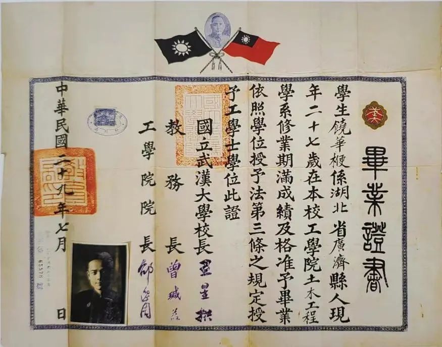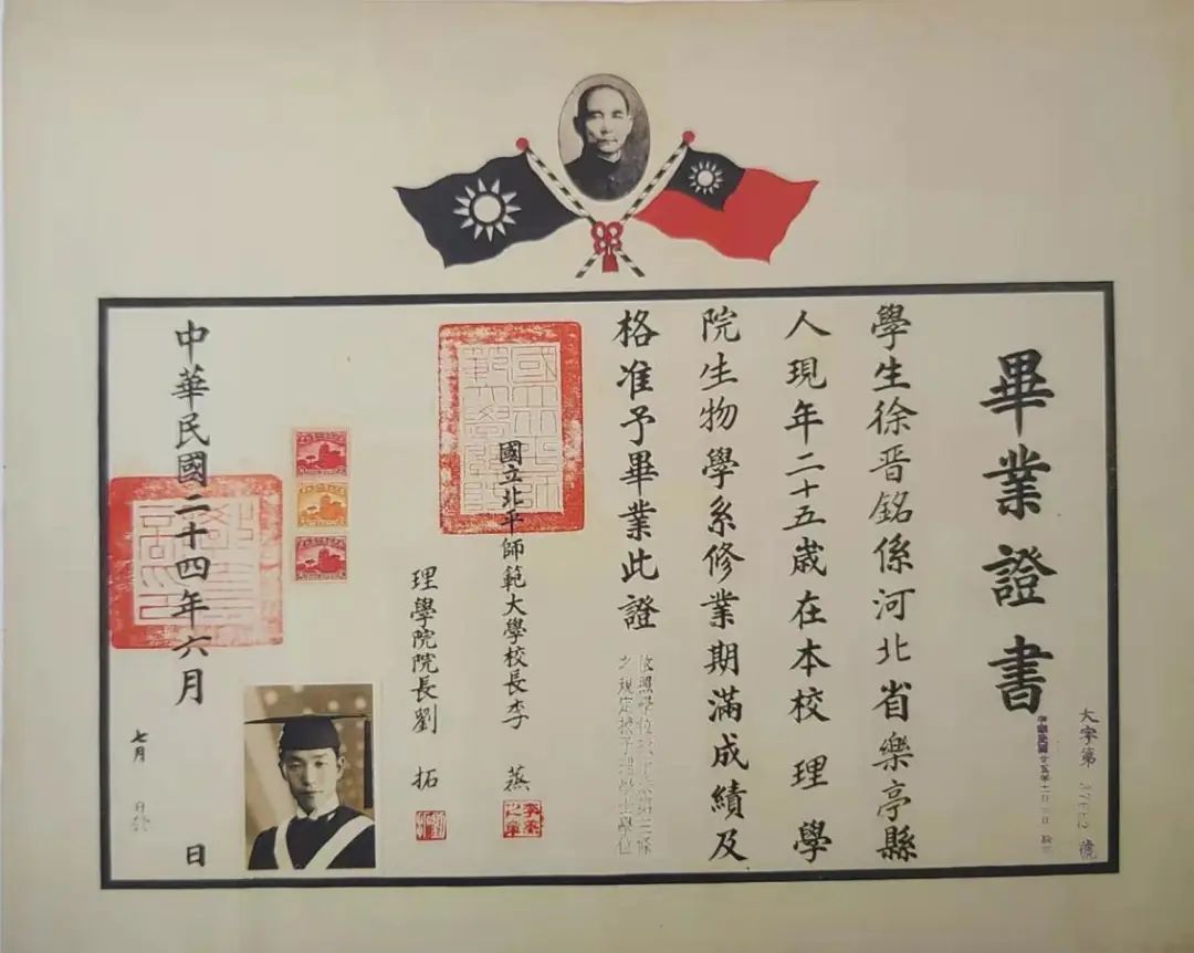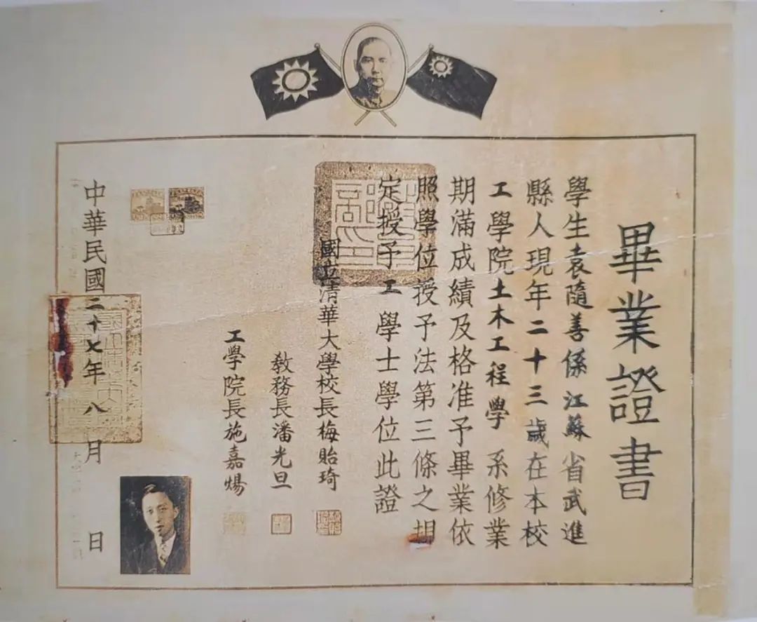 在国民政府统治那个时期,摄影技术有所进步并且得到愈发广泛地普及,这使得毕业文凭开始有了粘贴毕业生照片这样的情况。1935年北平师范大学生物学系有个叫徐晋铭的学生,他的毕业证书是如此。同理,1938年国立清华大学土木工程学系毕业生袁随善的证书,也都遵循了相对简约质朴的那种风格。
