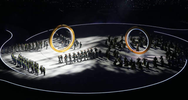 有更多的圆环,是缓缓地升起的,于空中进行交汇,彼此重叠,最终组合成奥运五环那样的形状。而这个简单的舞蹈动作,传达出不同的文明,得要相互理解、相互融合的奥林匹克精神句号。