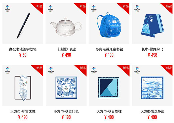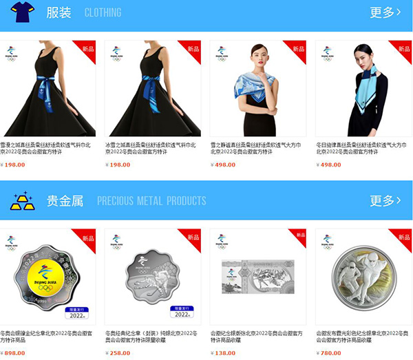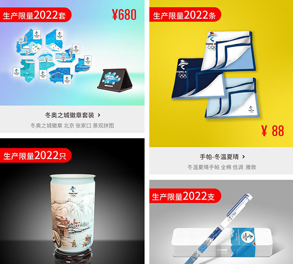 2017年12月16日的下午时分 ,北京2022年冬奥会的官方网店于天猫平台开启了预售。首批上线的有包含徽章 连同服装 以及贵金属和文具还有邮品这五大类的50余款商品 ,从会徽首发纪念徽章起始接受预订。