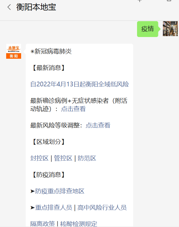 你要是于微信里进行操作,能够直接于“衡阳本地宝”微信公众号对话框之中回复“疫情”,那系统就会自动推送最新的重要通知以及防控区域的划分信息,着实十分便利。