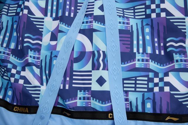 中国代表团所装备的核心的设计元素是名为“双胜纹”的纹样,该纹样是由两个菱形相互交叠并且穿插而形成的。在中国的传统文化里,菱形交叠所蕴含的意义是胜利不断叠加胜利,其代表的是祥瑞以及同心共赢这种美好的祝愿。设计师把这个传统的纹样进行现代化的处理之后,将其运用到服装的显著的位置上。