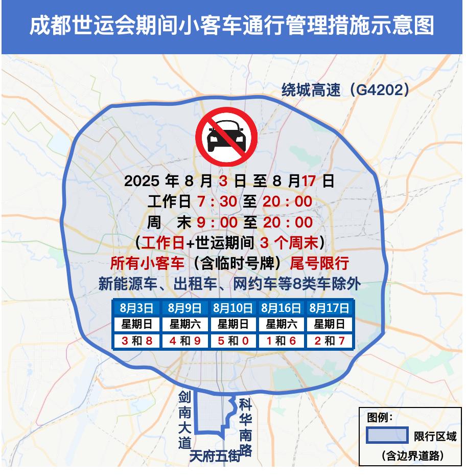 2025年8月3日起,至8月17日,成都将施行一套临时性交通管理举措,这十五日期间,限行规定与平常差异颇大,主要是为应对赛事期间交通压力!