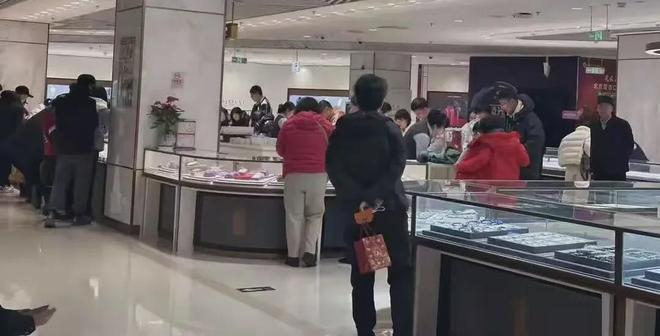 店员介绍,店内上新了不少新年饰品,而且同步推出了春节满减活动,假日以来,除了除夕晚上提前关门外,春节这几天都是正常营业的,购金队伍从早上开门到晚上闭店一直有。