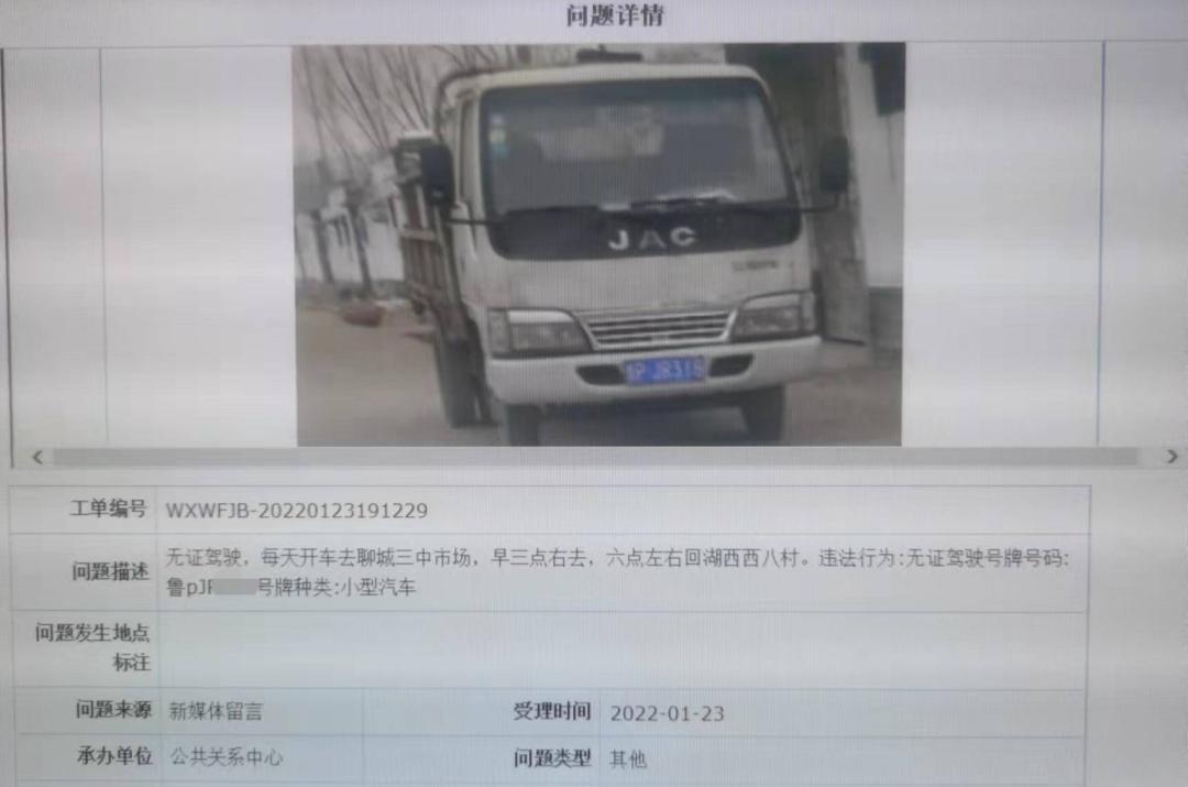 1月 23日,有一起成功举报案例极具说服力,有市民察觉到有人处于无证驾驶状态,该市民详尽地记录下违法人的活动规律,每天凌晨三点左右,此人去往聊城三中市场,到了六点左右,又返程回到湖西西八村,车牌号鲁 PJR8号也被清晰得拍摄下来,交警依据这些线索进行蹲点守候,最终顺利地将违法人员查获。