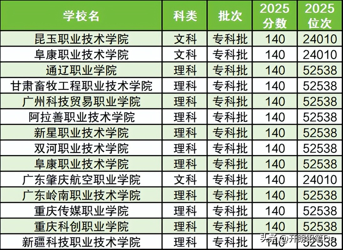 专科批次里,低分院校数量是最多的,2025年时,新疆专科线为140分,有13所学校,其录取最低分恰好是140分。对于文科生而言,可以关注昆玉职业技术学院、阜康职业技术学院、广东肇庆航空职业学院,而理科生能考虑通辽职业学院、甘肃畜牧工程职业技术学院、广州科技贸易职业学院等。